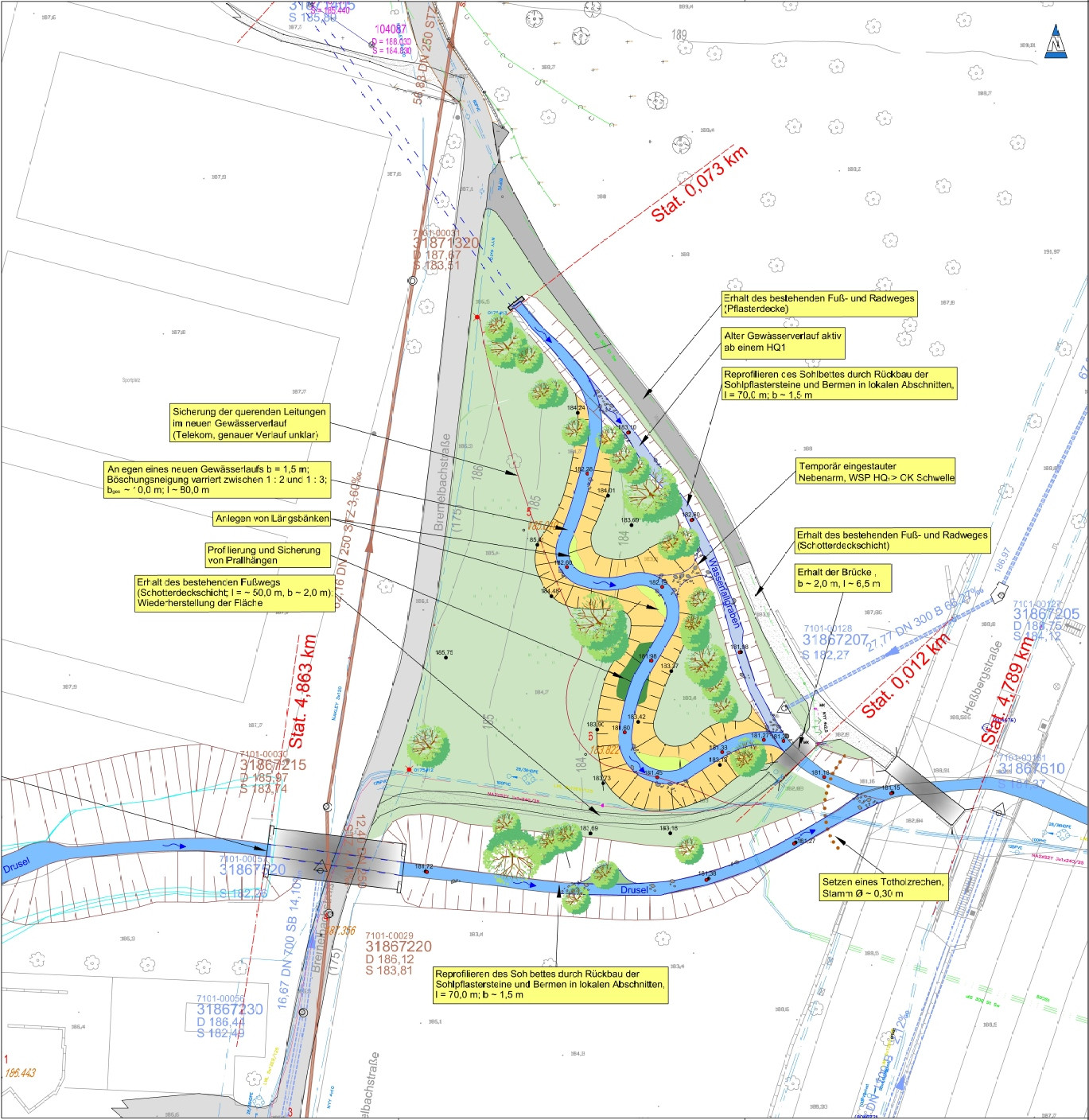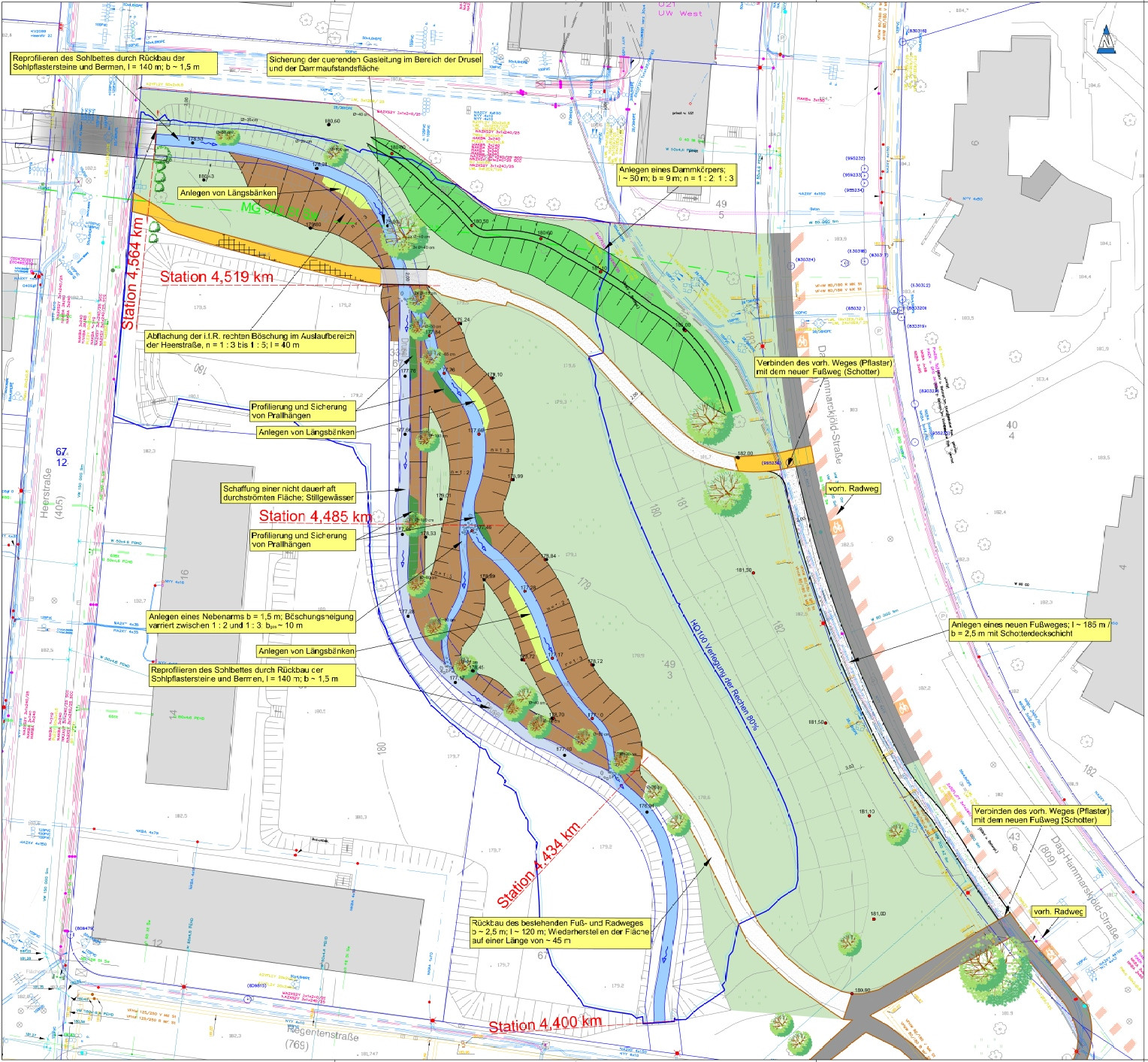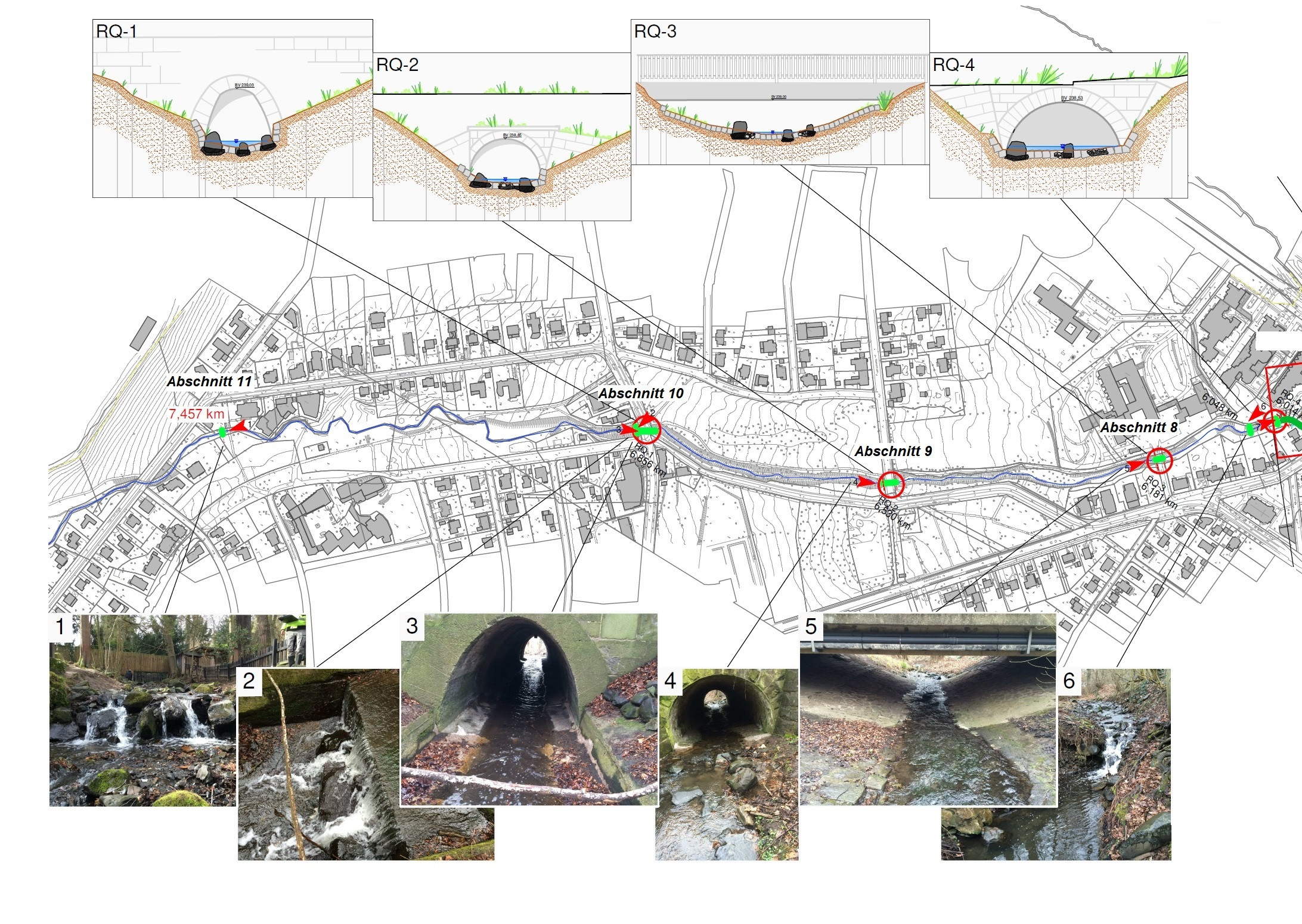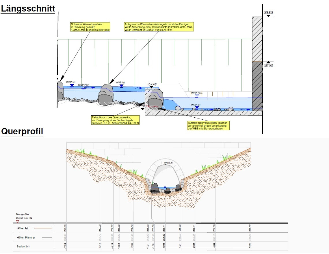 Die Planung umfasst insgesamt neun einzelne Abschnitte mit strukturverbessernden Maßnahmen auf einer Fließstrecke von ca. 2 km (Abschnitt 1 – 7) und dem Herstellen der aquatischen Durchgängigkeit in 4 Bereichen (Abschnitt 8 – 11).