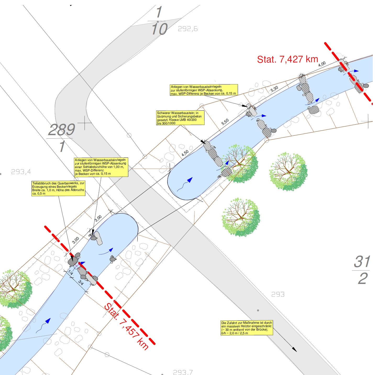 In den Abschnitt 8 – 11 sollen vorhanden Querungsbauwerke (Sohlabstürze) zur Herstellung der Durchgängigkeit des Gewässers umgestaltet werden.