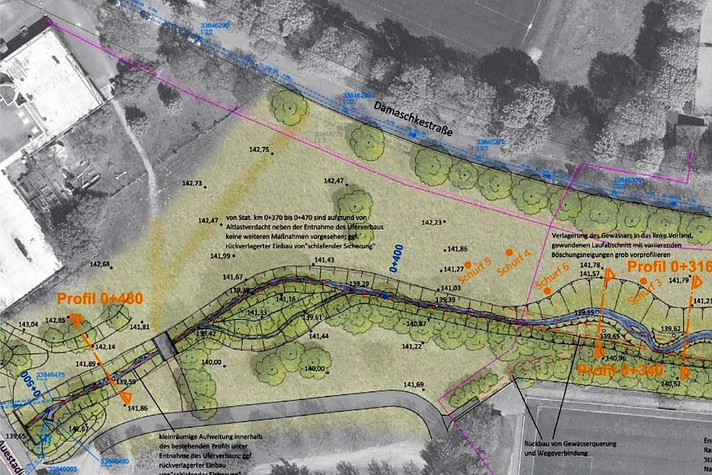 Der Schönfelder Bach im Bereich der Damaschkestraße soll mit Mitteln aus der Ausgleichsabgabe auf einer Länge von ca. 270 m naturnah umgestaltet werden. Hierzu gab es im Vorfeld einen Zuwendungsbescheid von der Unteren Naturschutzbehörde der Stadt Kassel in Höhe von 130.000 €. Das Ing.-Büro WAGU aus Kassel wurde von KASSELWASSER mit der Aufstellung des Genehmigungsentwurfes betraut.